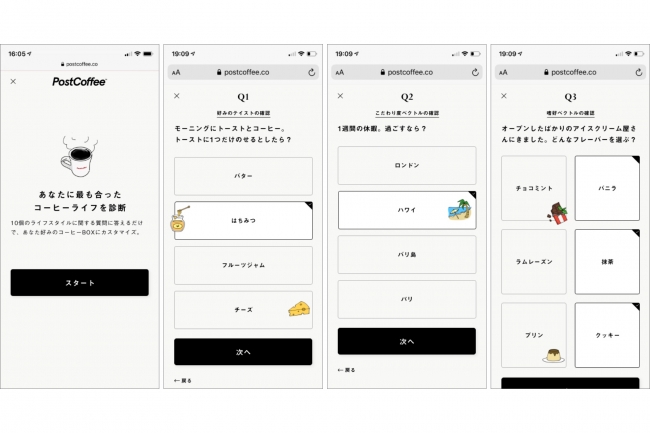 利用開始時には「コーヒー診断」があり、あなたの好きなスイーツ・お酒・ライフスタイル等から約30万通り(または15万通り以上)もの組み合わせの中からあなた専用のコーヒーセットを導き出してくれます。